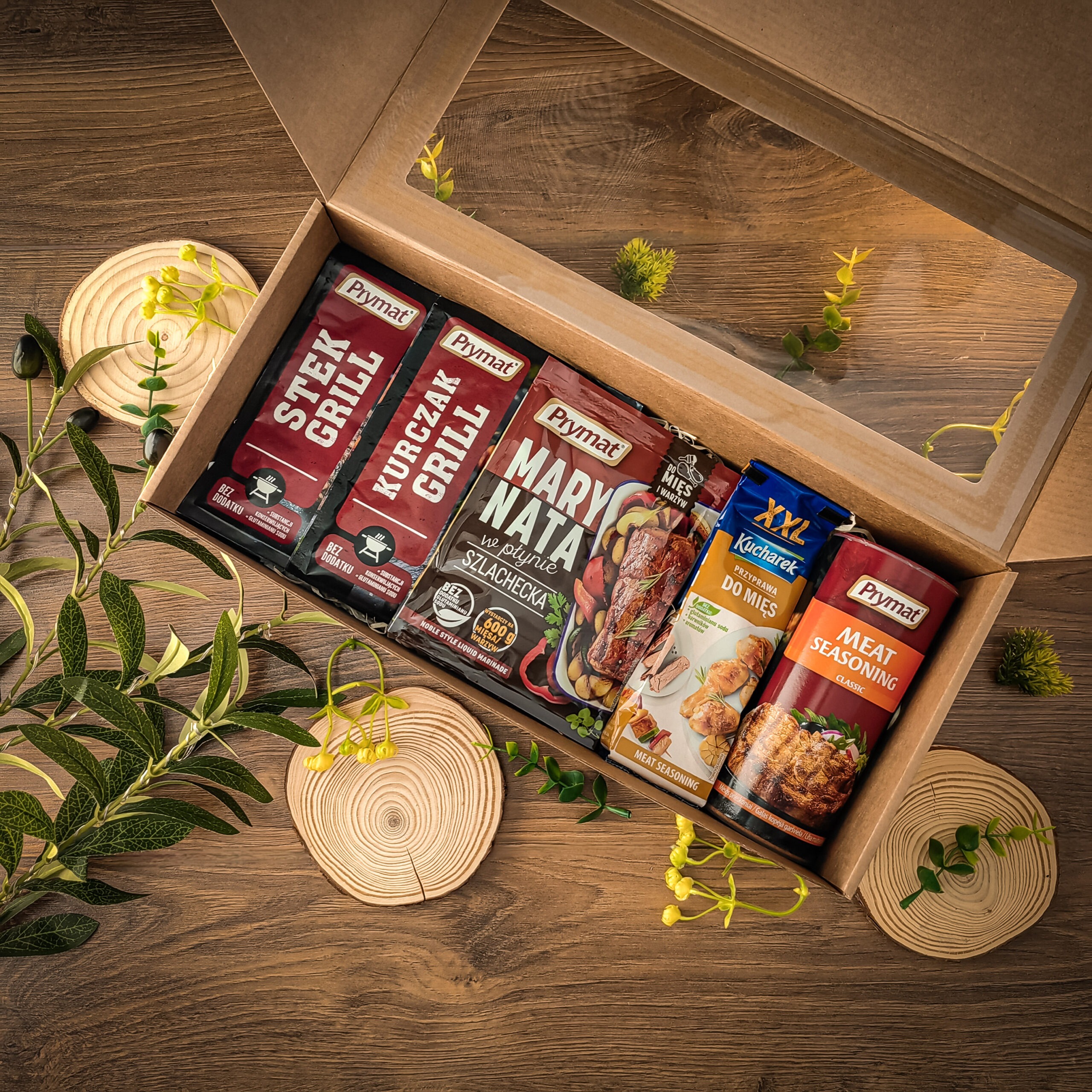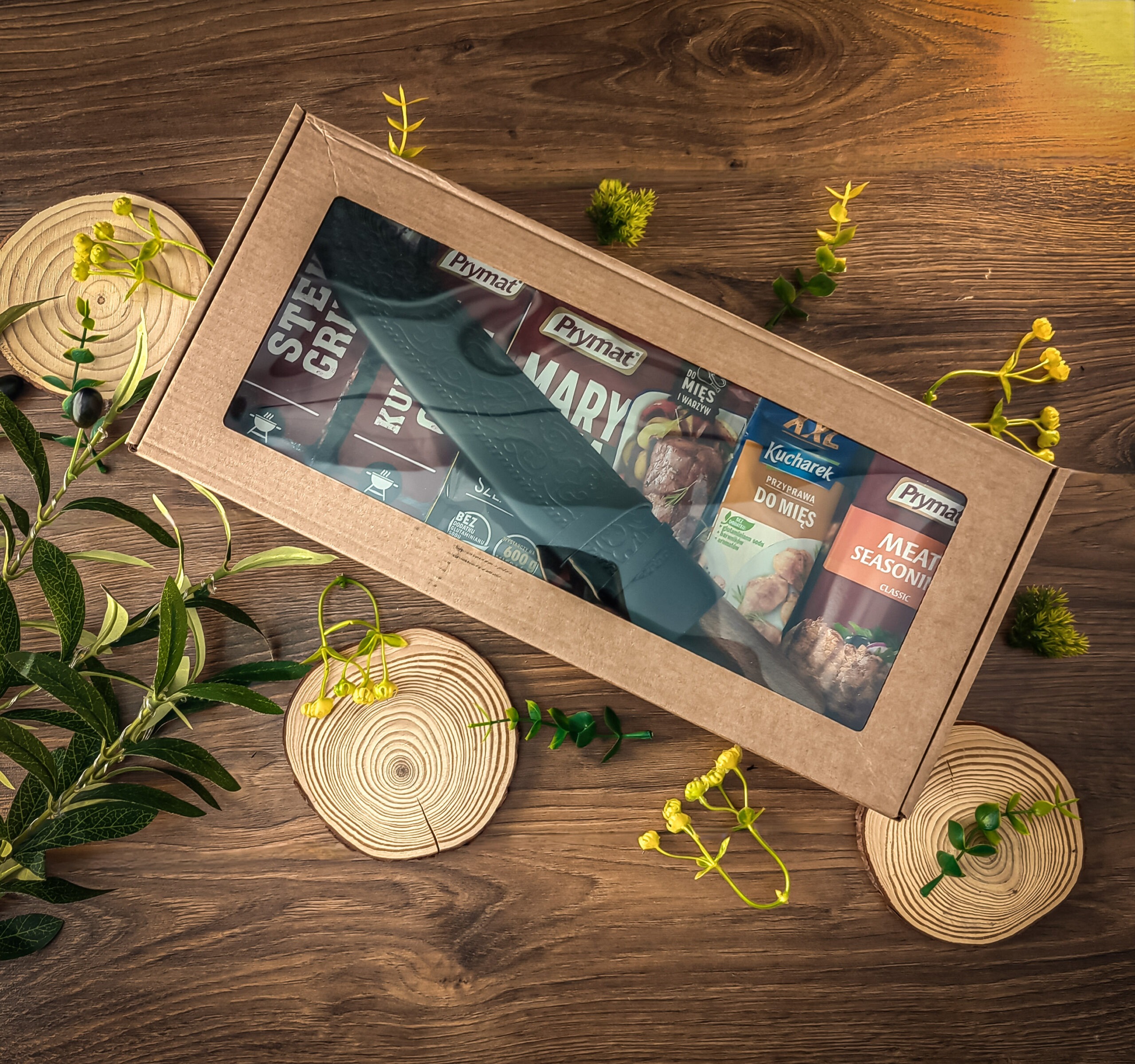 Практичный и стильный набор для тех, кто любит готовить мясо на гриле или дома. Внутри — универсальные приправы, маринад и специи, которые помогут раскрыть вкус мяса, курицы и овощей, а также удобный нож с деревянной ручкой из прочной подшипниковой стали — отличный помощник как на кухне, так и на природе.
